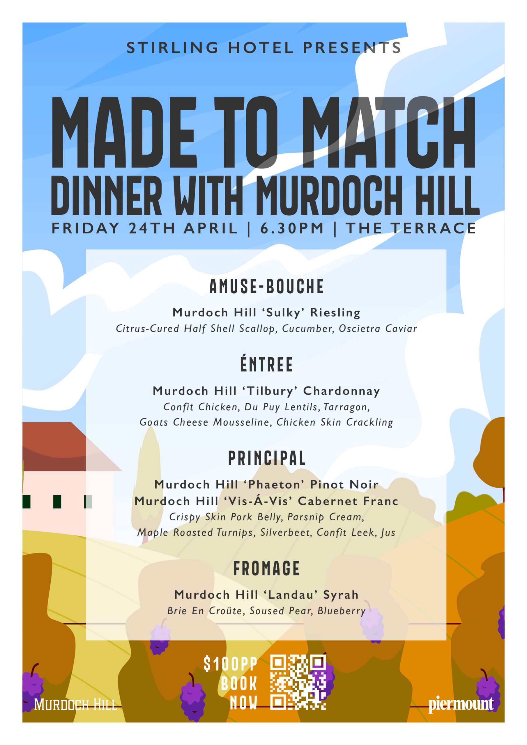 Join us for a captivating evening with Murdoch Hill wines perfectly paired with a thoughtfully curated menu that is Made to Match. Hear from Michael Downer, Murdoch Hill’s chief winemaker, and discover how his minimalist, regenerative approach lets the Adelaide Hills’ unique character shine in every glass. Savour each course alongside the wines for an evening of flavours, stories, and exceptional experiences. $100 per person – book your seat today.